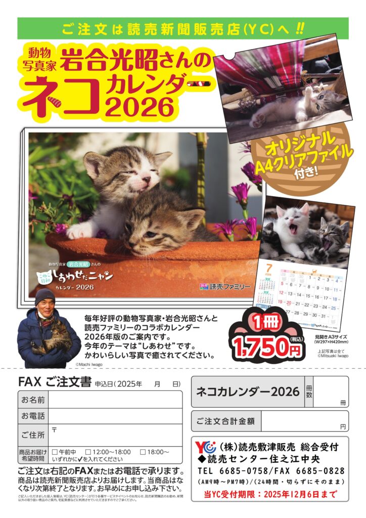 読売センターからのお知らせ【落合光昭さんネコカレンダー販売】