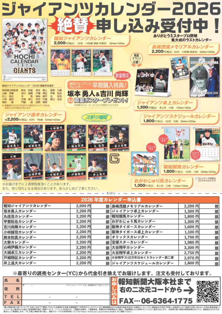 スポーツ報知取り扱い 2026年度 各カレンダー販売スタート
