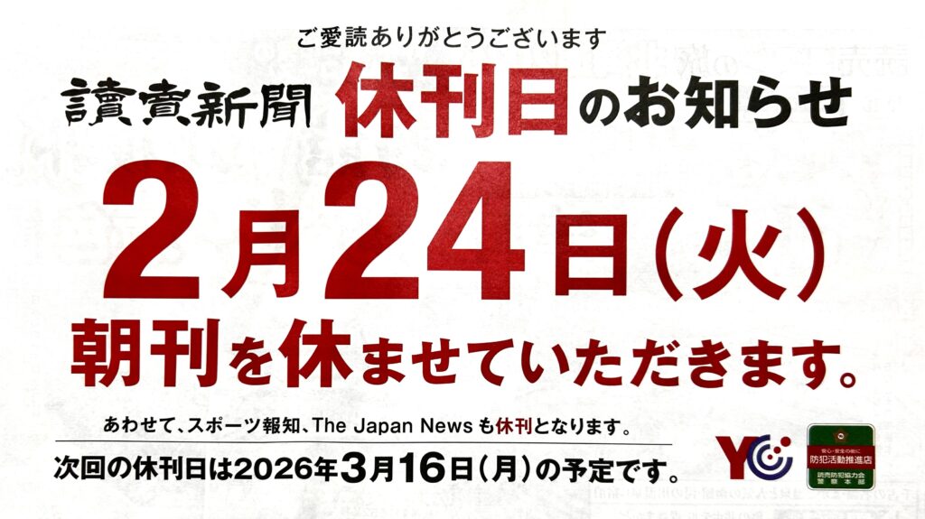 明日2月24日(火)朝刊を休ませていただきます。