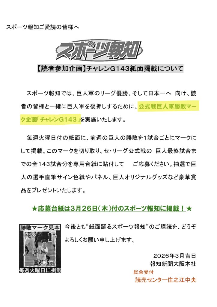 そしてスポーツ報知では、公式戦巨人軍勝敗マーク企画【チャレンジG143】を実施いたします。